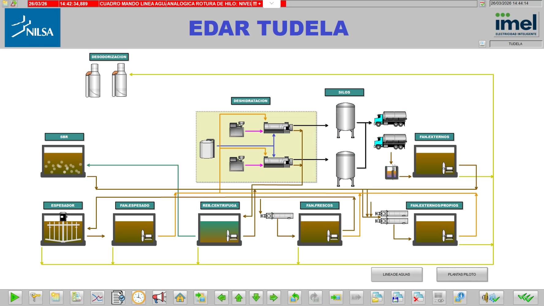Las plantas piloto cuentan con un S7-300 y periferias en PROFIBUS. El sistema SCADA se basa en Siemens WinCC V8, mientras que el telecontrol se realiza mediante SINAUT ST7, con equipos como TIM 1531 y Scalance, integrados con el sistema central de NILSA.